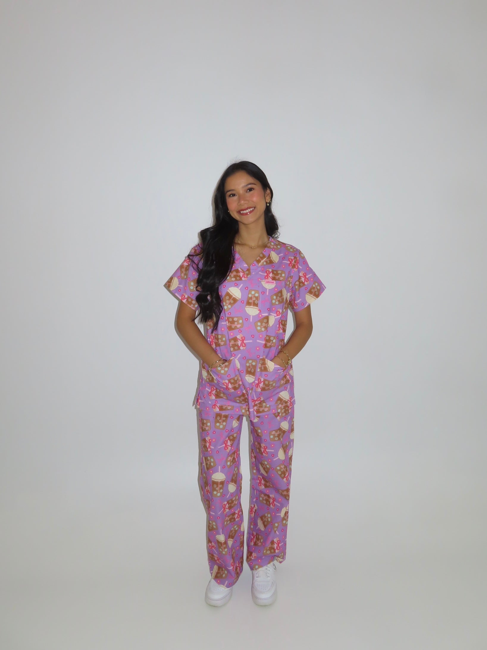 Fuel your shift with our Coffee O’clock scrub set - the perfect blend of cozy charm and caffeinated vibes. This set is the perfect pick-me-up that keeps you looking cute while staying comfortable all day long